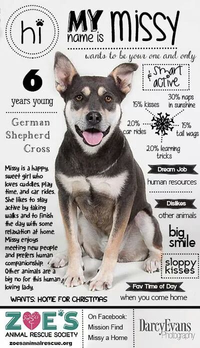 Missy was a dog who had been in foster care for over a year so we were campaigning hard to promote her. Because she was an older dog with some special needs, she needed extra marketing to find a home.